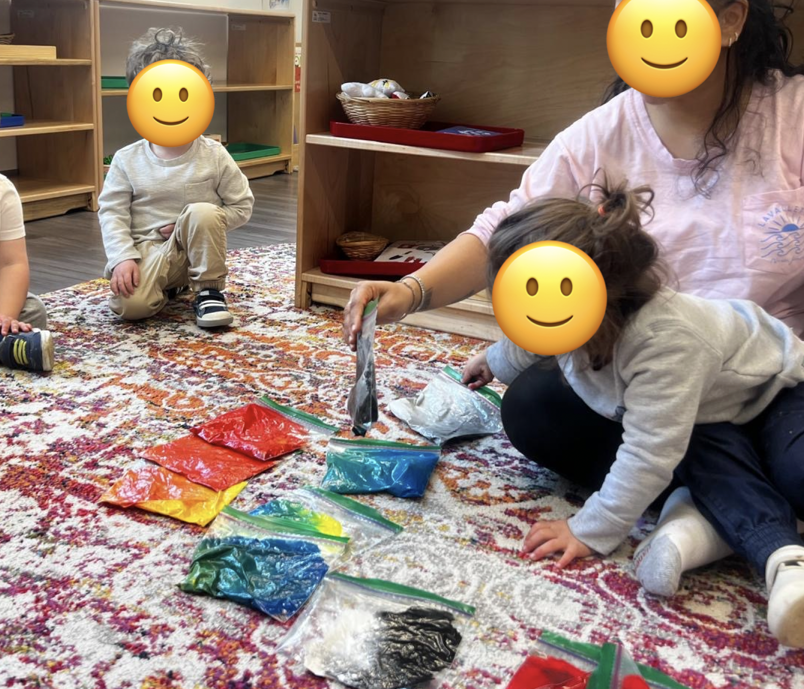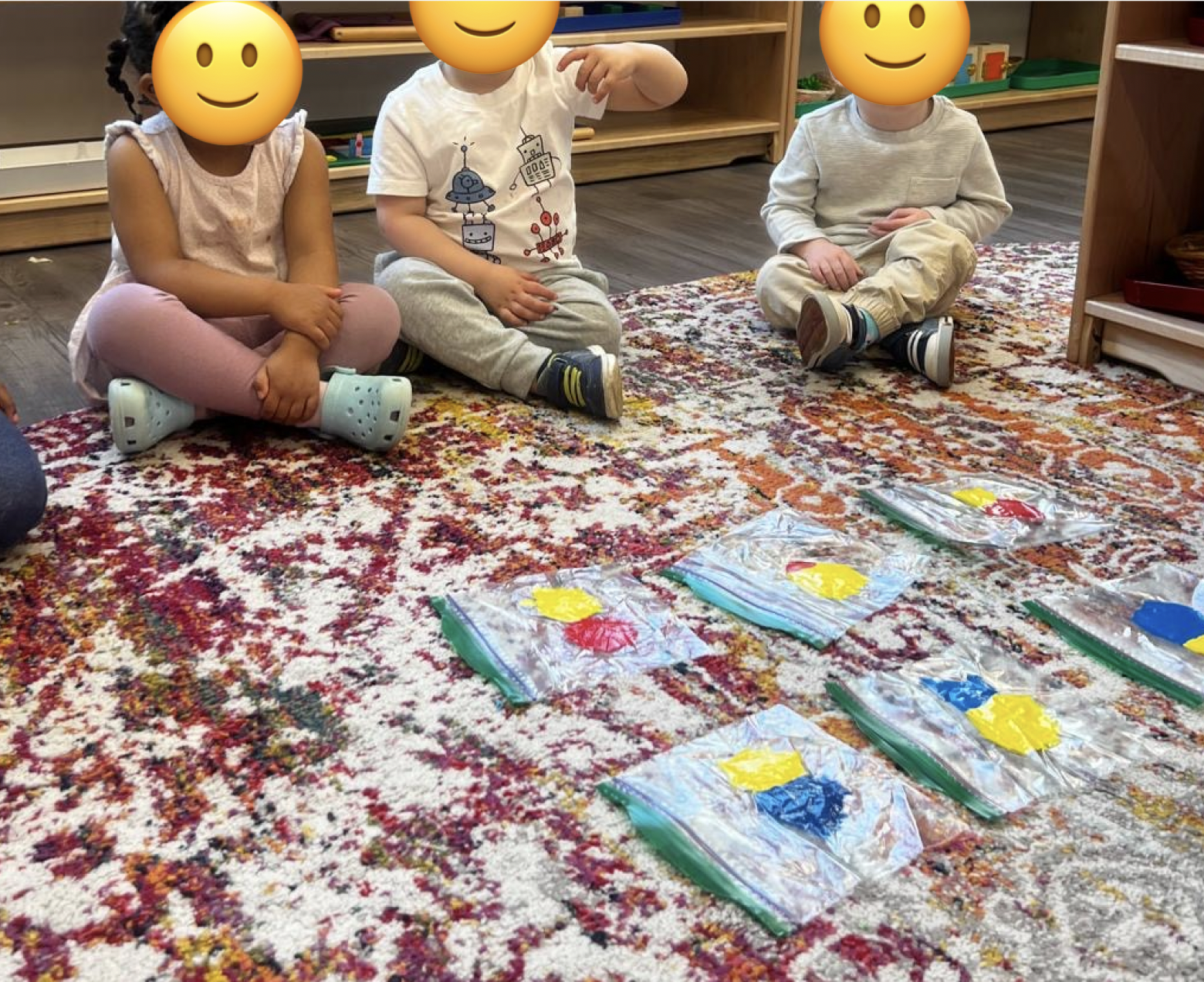 - Ask 3 kids to take one bag, each rub their bag. Have them do it at the same time, so they are seeing the color mix simultaneously. Put the 3 bags in the middle of the circle to compare the different shades within a hue. Have the kids name things out loud in the world with those colors, which is good for interaction
